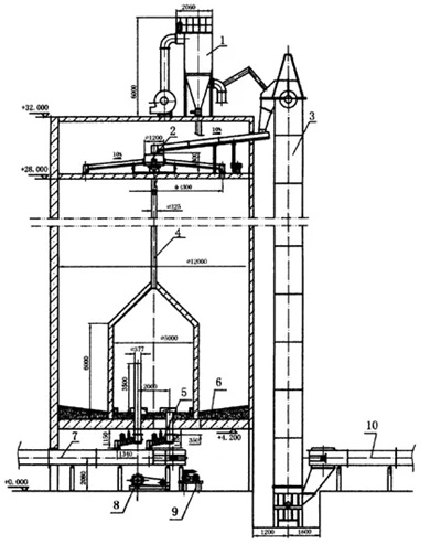 連續(xù)式均化庫是生料從庫頂連續(xù)進(jìn)料,經(jīng)過充氣攪拌的同時連續(xù)出料,庫在中心位置設(shè)一個圓柱形混合室,以降低庫內(nèi)卸料壓力,消除漏斗流。在混合室周圍6-12卸料孔,在混合室與庫壁之間有6-12個充氣區(qū),卸料時輪流向中心室進(jìn)料,進(jìn)入混合室的物料因混合室連續(xù)充氣而進(jìn)一步混合,使合格的生料從高位溢流管卸出,多余氣體則由排氣管排至外環(huán)區(qū),并抽至收塵器凈化,但要求生料制備系統(tǒng)連續(xù)穩(wěn)定可靠,具有投資省,電耗低,工藝布置靈活,結(jié)構(gòu)緊湊,操作簡單等特點。