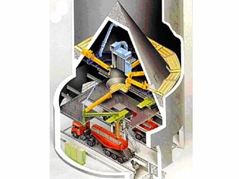 連續(xù)式均化庫是生料從庫頂連續(xù)進料,經(jīng)過充氣攪拌的同時連續(xù)出料,庫在中心位置設(shè)一個圓柱形混合室,以降低庫內(nèi)卸料壓力,消除漏..